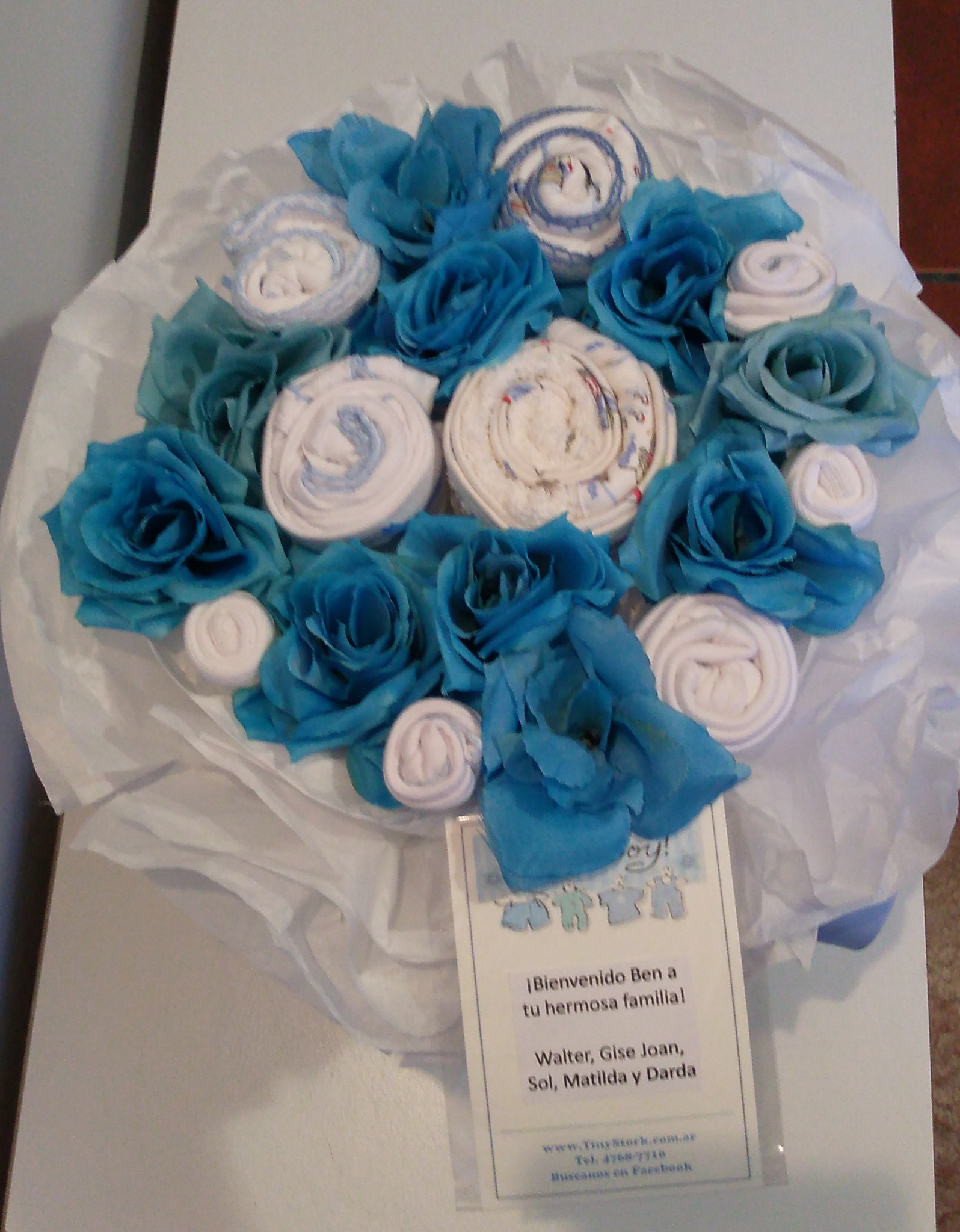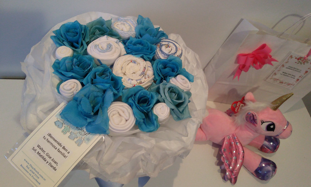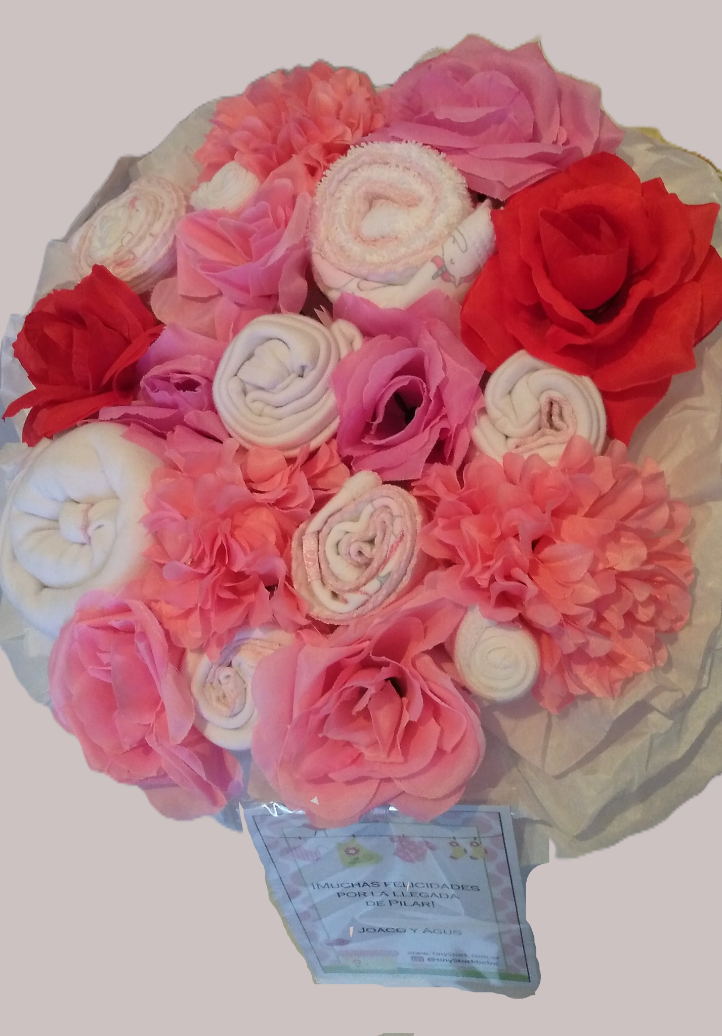 El bouquet contiene 1 babita doble algodón pima con nombre bordado - 1 babero de algodón pima con nombre bordado - 1 gorrito de interlock con terminación de picot - 1 conjunto de batita y pantalón de interlock de algodón con terminación picot rosa ó celeste - 1 par de escarpines de interlock con terminación de picot - 1 toalla chica de 35x25cm con con emboso estampado de algodón pima con nombre bordado - 1 par de medias de cashmilón marca Elemento talle 6 meses marca Elemento - muchas flores de tela,