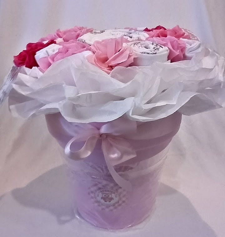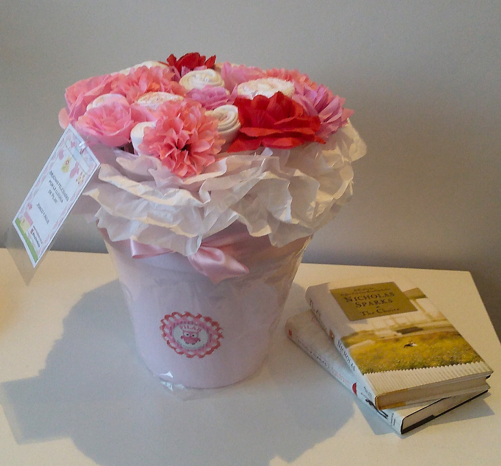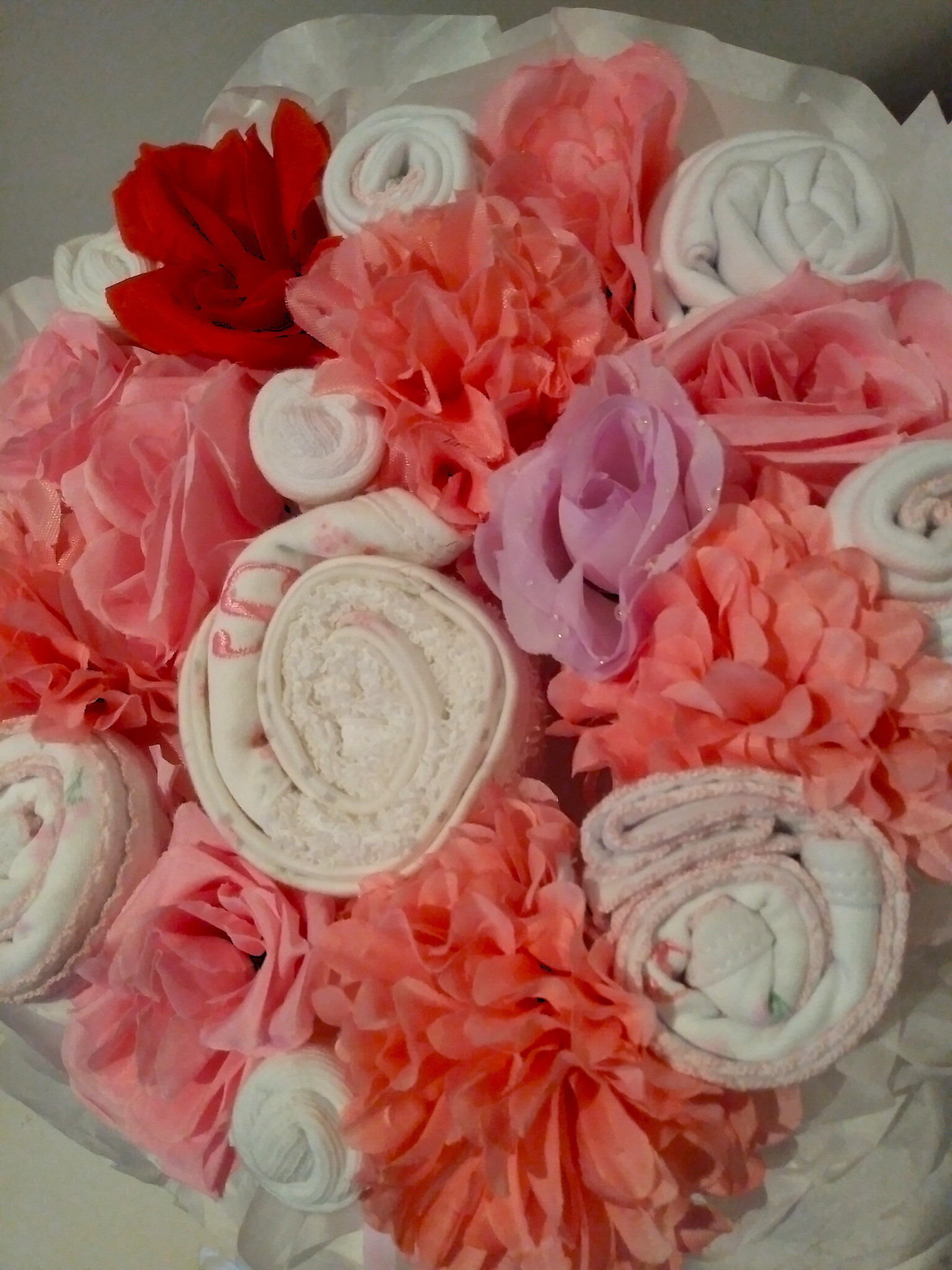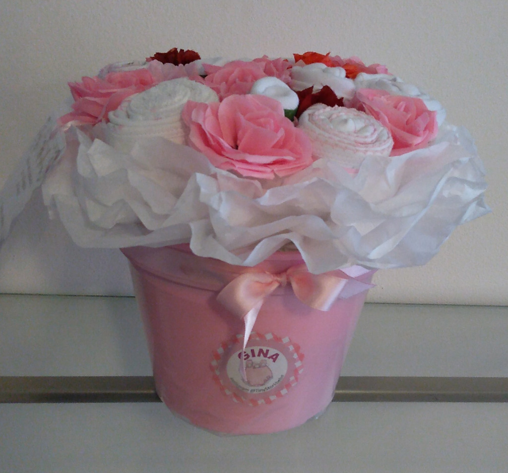 El bouquet contiene 1 babita doble algodón pima con nombre bordado - 1 babero de algodón pima con nombre bordado - 1 gorrito de interlock con terminación de picot - 1 conjunto de batita y pantalón de interlock de algodón con terminación picot rosa ó celeste - 1 par de escarpines de interlock con terminación de picot - 1 toalla chica de 35x25cm con con emboso estampado de algodón pima con nombre bordado - 1 par de medias de cashmilón marca Elemento talle 6 meses marca Elemento - muchas flores de tela,