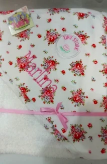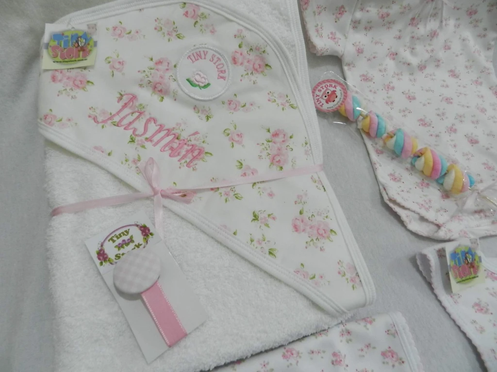 1 toallón con capucha de algodón pima estampado y nombre bordado de 80cm x 75cm , 1 toalla chica con emboso de algodón pima estampado y nombre bordado