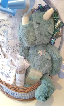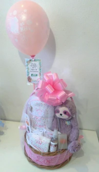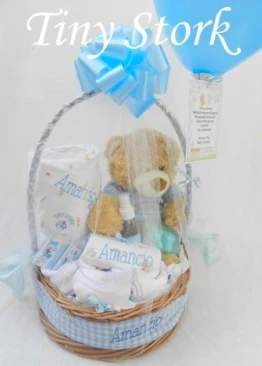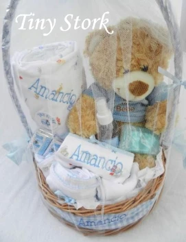 1 Canasta de mimbre con manija forrada de 32cm de diámetro y 40 cm de alto, moños laterales y tela perimetral con el nombre del bebé - 1 toallón con capucha de 75 cm x 80 cm de toalla doble de excelente calidad, capucha de algodón pima estampado y nombre bordado - 1 Babero de algodón pima bordado con el nombre del bebé - 1 jabón de glicerina con patitas de coco - 1 Peluche mediano de 35cm de largo (oso, oveja, zorro, gato, perro ó elefante, preguntar stock disponible ) - 1 Aromatizante para la ropita del bebé - 1 conjunto de batita y pantalón de interlock de puro algodón - 1 gorrito de interlock de puro algodón con terminación picot . La canasta se envuelve en tul con gran moño, globo y tarjetón impreso.